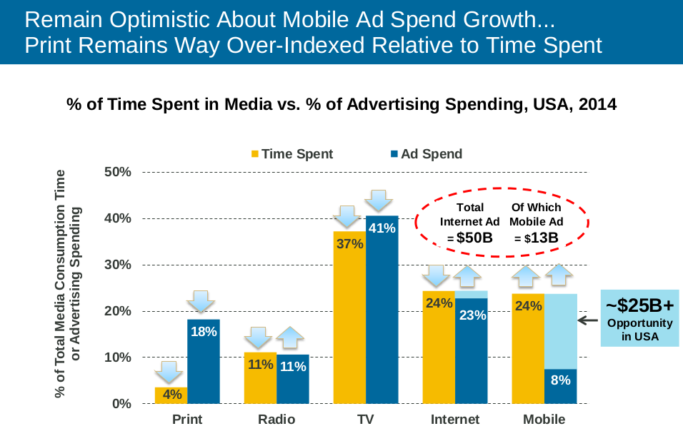 Mettendo in relazione il tempo di “engagement” con l’attuale spesa effettuata dal settore pubblicitario sui vari canali si capisce come vi sia un’azione mirata a sfruttare maggiormente il canale mobile che, per varie ragioni, non ultimo la grandezza degli schermi che penalizzano il cosiddetto visual advertising, potenzialmente mostra ampi margini di  crescita – come realizzarli è un bel problema vista anche la natura “permalosa”, più intimistica e personale, dei dispositivi. Tra l’altro, per catturare attenzione la pubblicità visuale web si sta abituando a occupare porzioni considerevoli dello schermo, preferibilmente con applicazioni video e la cosa che mal si concilia con la limitatezza spaziale e variabile, in base ai vari form factor dei dispositivi.  I media cartacei, rispetto al tempo dedicatovi, appaiono invece supervalutati in termini di investimenti pubblicitari.