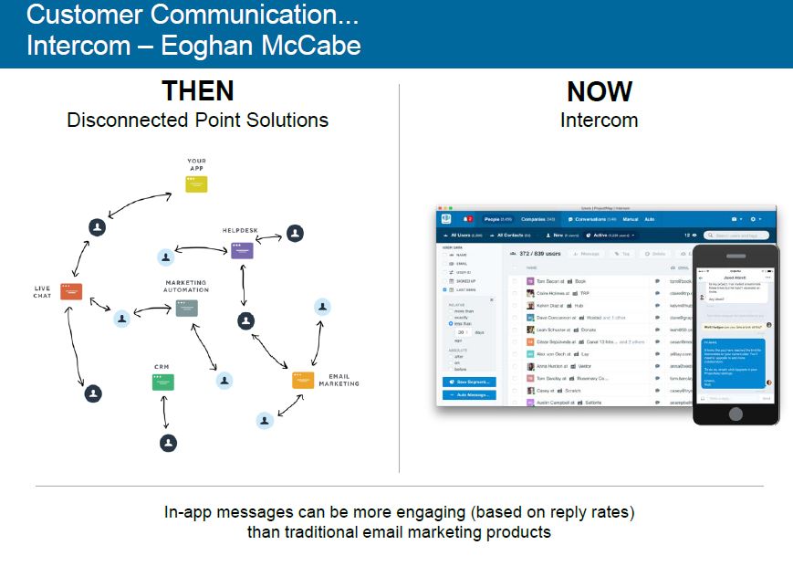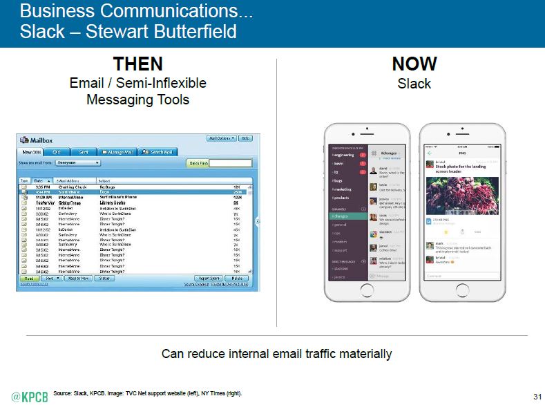 Una sezione del report denominata re-imagining  ci evidenzia come il mondo aziendale appaia ormai andare a traino della user experience digitale a cui le persone si abituano negli usi più generali e trasversali, e uno dei driver principali di queste nuove soluzioni è la semplificazione/integrazione dei processi. L’applicazione Slack ne è un esempio. Essa infatti si propone come ambiente di comunicazione collaborativa unificante da utilizzare ovunque (app mobile e desktop), integrabile con altri popolari servizi su cui normalmente si depositano informazioni quali Google Drive, Dropbox, OneDrive, Box, ecc. così come con i sistemi di notifica dei vari sistemi operativi per segnalare l’accadimento di eventi. Slack è organizzato per canali/progetti (#) in cui è possibile indirizzare, allegandovi tutti i materiali di supporto necessari (testo, audio/video, ecc.) le relative comunicazioni, che rimangono registrate e searchable  nella loro evoluzione.