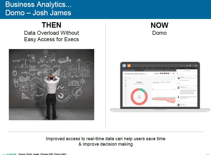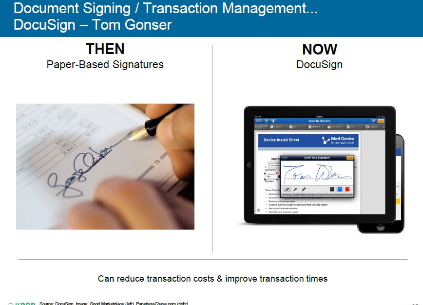 Il servizio Domo, un sistema di business intelligence in cloud, ha invece come obiettivo di centralizzare e illustrare nella maniera più diretta e comprensibile possibile tutti gli indicatori che si vogliono utilizzare per monitorare e controllare gli andamenti degli eventi/fenomeni a cui siamo interessati, indicatori che sono il risultato di analisi e stream informativi alimentabili dalle più svariate fonti interne ed esterne all’azienda (qui si può avere la lista dei connettori possibili). Da parte sua, Docusign si dedica a fluidificare le transazioni che richiedono infine un assenso formale tramite una firma personale, e si cura di farlo utilizzando firme digitalizzate.