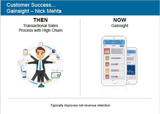 Gainsight è un servizio disegnato attorno a pratiche e tecnonogie che mirano a rafforzare la relazione/soddisfazione tra cliente e fornitore nelle nuove forme di economia (subscription economy) dei servizi pay-per-use, dove la fidelizzazione del cliente diviene fondamentale in quanto si è in situazioni in cui, con barriere a entrare e uscire veramente basse, il successo del fornitore è mantenuto solo dal concomitante successo del compratore.