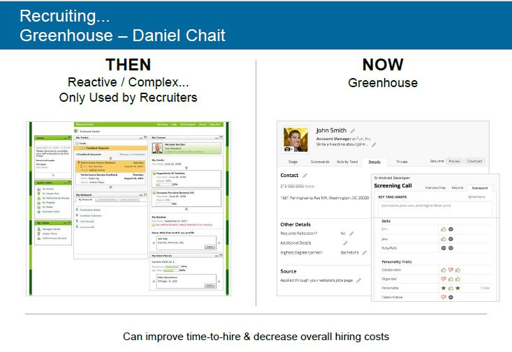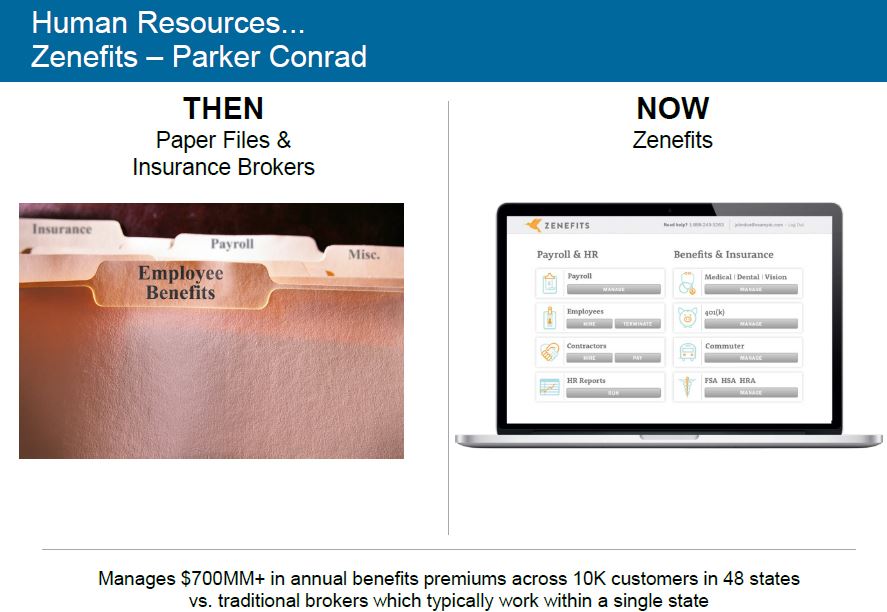 Zenefits è un servizio in cloud, quindi on-demand su internet (Software as a Service, SaaS) che gestisce per le aziende la funzione di Human Resource (buste paga, sistemi di benefit, assicurazioni sanitarie, offerte lavoro, ecc.) offrendo il servizio gratuitamente – gli introiti sono assicurati dalle aziende associate che forniscono i servizi relativi ai piani assicurativi e di benefit. Sempre nel tema del lavoro Greenhouse offre un servizio SaaS per la gestione delle procedure di ricerca e assunzione dei candidati-lavoratori.