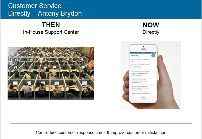 Directly è un servizio per migliorare l’efficacia del customer care in quanto smista le chiamate di supporto effettuate dalla clientela direttamente ai lavoratori che nell’azienda sono ritenuti più esperti della materia. Le domande di aiuto sono dirottate sulla base del tema e della disponibilità dell’esperto che, munito dell’applicazione mobile, entra in un sistema incentivante di ricompense legate al soddisfacimento del cliente.