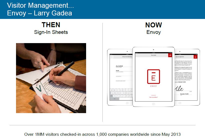 Envoy è una soluzione che si occupa dell’accoglienza dei visitatori di una location. L’applicazione in cloud richiede l’uso di un iPAD locale (per sede) e una stampante di etichette e funziona come receptionist pronta a collezionare i dati del visitatore e produrre un eventuale badge, oltre che pre-avvertire le persone da incontrare.